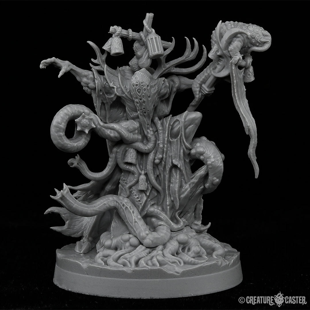 Masuzi possess a unique sorcery that allows them to modify flesh at will. Intestines warp and flow into monstrous leeches. Bone spurs and flesh whips abound. Their flesh has been warped and disfigured so often that they are now held together more by rags and magical energies than by physical substance. Even more disturbing than what a Biomancer can do to their own body, is what their powers can do to the flesh of another. Atrophying muscles, aging victims by years in mere moments, or turning blood into acid are just a few of the horrors they can unleash. Contents: Resin Masuzi (10 parts), 2 Resin Tokens (Decay, Suppress)